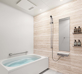 | カラー | 浴槽:プレシャスホワイト、浴室パネル:1面デザイン(フロウストーンテラコッタ1面+ホワイト3面) 床:キープフリーンフロア ハイクラス(カームホワイト) |